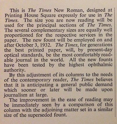 Even if we limit ourselves to design and historical considerations, Times New Roman, despite being a serif typeface, possesses little of the “professional, solemn, and authoritative” aura. The typeface was designed in 1931 for The Times of London, and newspaper typefaces are typically engineered to print cleanly on cheap paper, conserve space, and support rapid scanning.