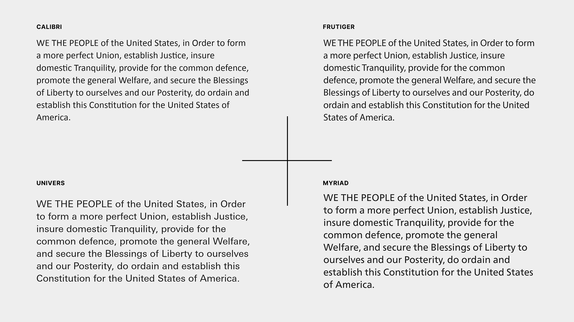 At this point, it might sound as though the argument is trending toward a defense of the Department’s earlier choice: Calibri. Unfortunately, Calibri is also a poor fit for formal contexts. While seriousness and authority aren’t the exclusive province of serifs, Calibri does little to convey those traits.