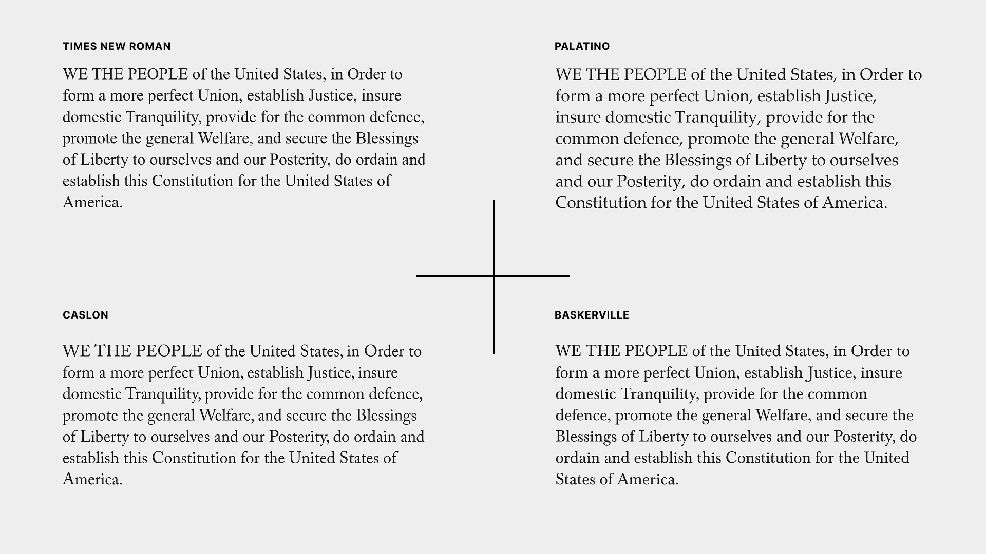 Thus, the design and historical reasons cited in Rubio’s memo don’t hold up. The formality and authority of serif typefaces are largely socially constructed, and Times New Roman’s origin story and design constraints don’t express these qualities. If Times New Roman carries authority at all, it’s primarily borrowed from the authority of institutions that have adhered to it. If the sincere goal were to “return to tradition” by returning to a serif, there are many choices with deeper pedigree and more fitting gravitas.