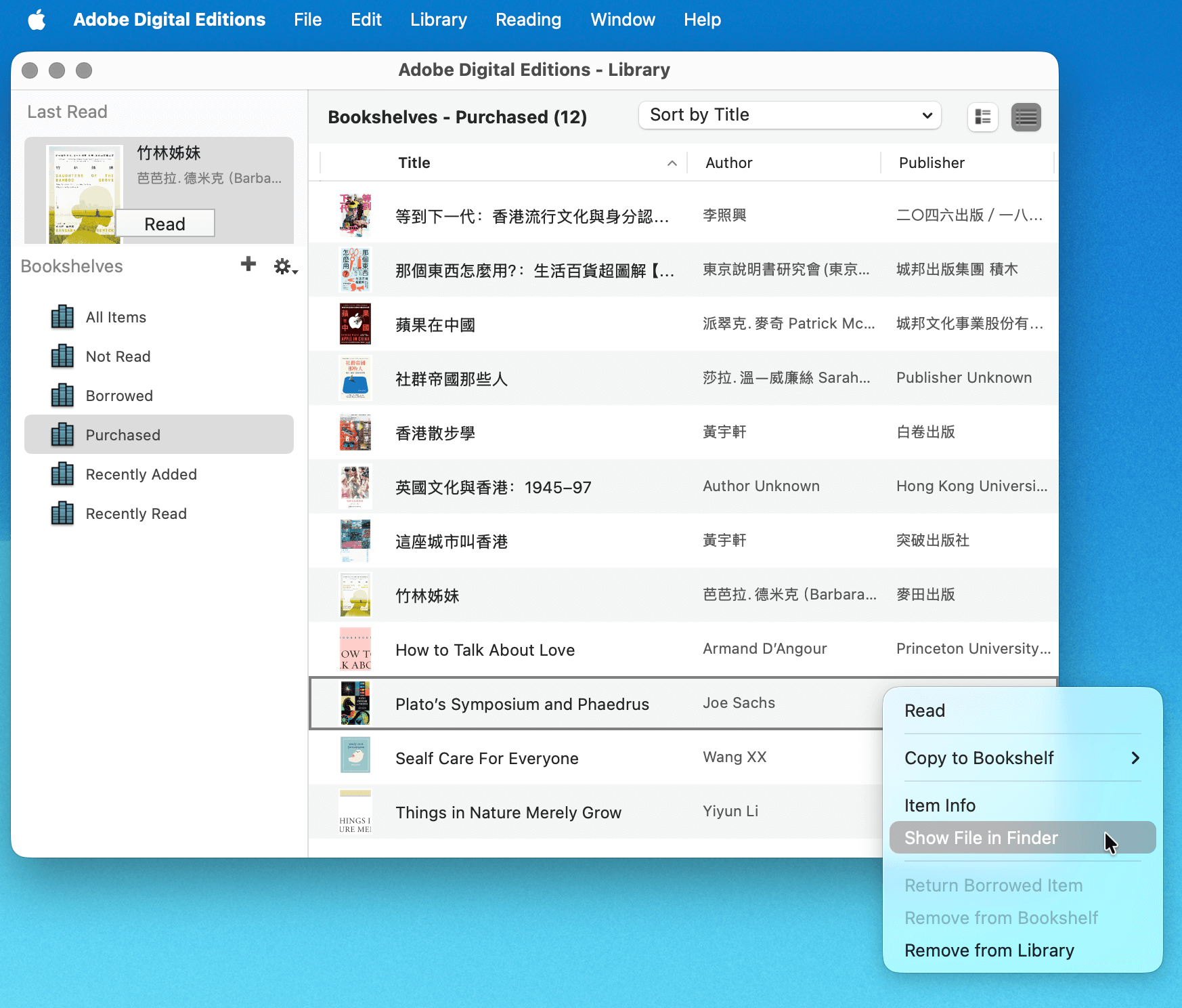 其一是 Kobo 的在线书店。由于 Kobo 在港台业务发展较广,Kobo 上的繁体作品(包括英文书的繁体译本)品种全、上架快,只略逊于博客来或诚品等纯中文平台;繁体书的定价也显著低于英文书。同时,由于使用通用的 Adobe Digital Editions 作为 DRM 方案,Kobo 是目前仅存少数易于解除 DRM 的电子书商。只要 (1) 在购买后选择「下载」;(2) 导入到 ADE 客户端,右键选择 Show File in Finder;然后 (3) 将所得的加密版本导入安装了 ACSM 插件的 Calibre,就能获得去除保护的 EPUB 文件,可以直接发送到 Kindle 阅读。