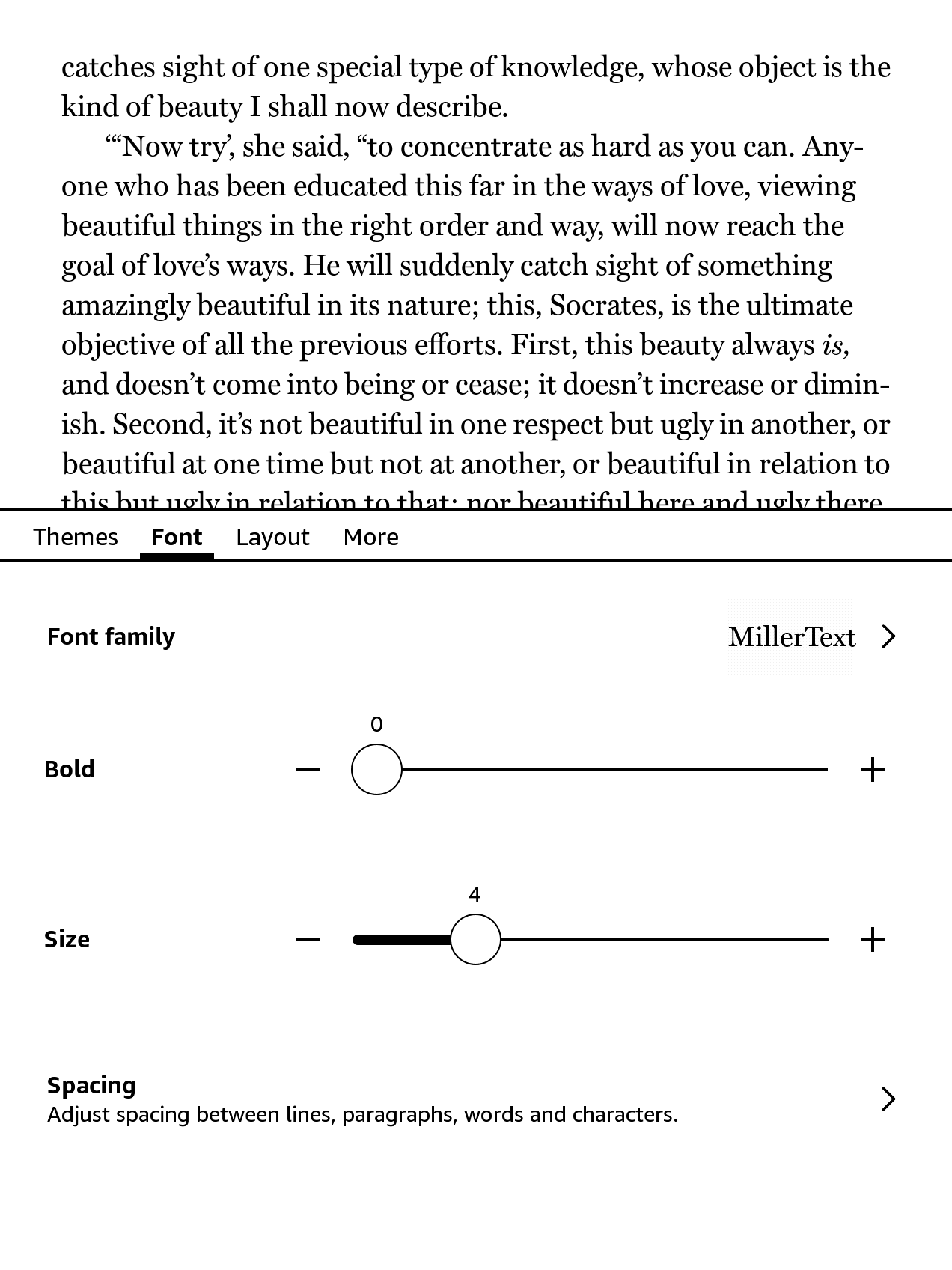 Kindle 的功能更新一向佛系,以至于虽然多年没用,基本功能和操作还是那些,很快就能重新上手。不过,经年累月,原生系统毕竟还是积累了一些有用功能。相比当年,现在原生系统可以很方便地载入外部字体,调整行距和页边距,以及将排版设置保存为主题。页面预览界面的交互改进和长按链接预览等功能也更方便快速扫读。Send to Kindle 也在 2022 年后支持了直接发送 EPUB。因此,即使收到的系统版本还可以越狱,我现在也直接用原生系统看 EPUB 了,只在看 PDF 的时候才切换到越狱后装的 KOReader,以便用上更完善的裁边和对比度增强功能。