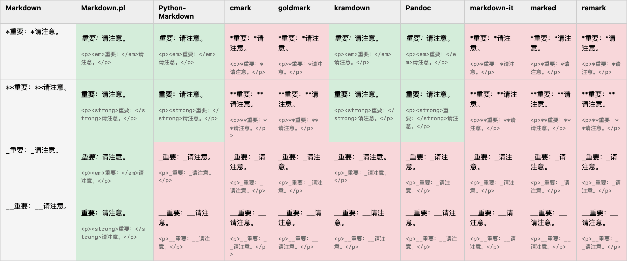 以下是一些常见 Markdown 处理器的渲染效果对比,其中不能渲染出中文间强调标记的几种处理器都是采用了 CommonMark 规范: