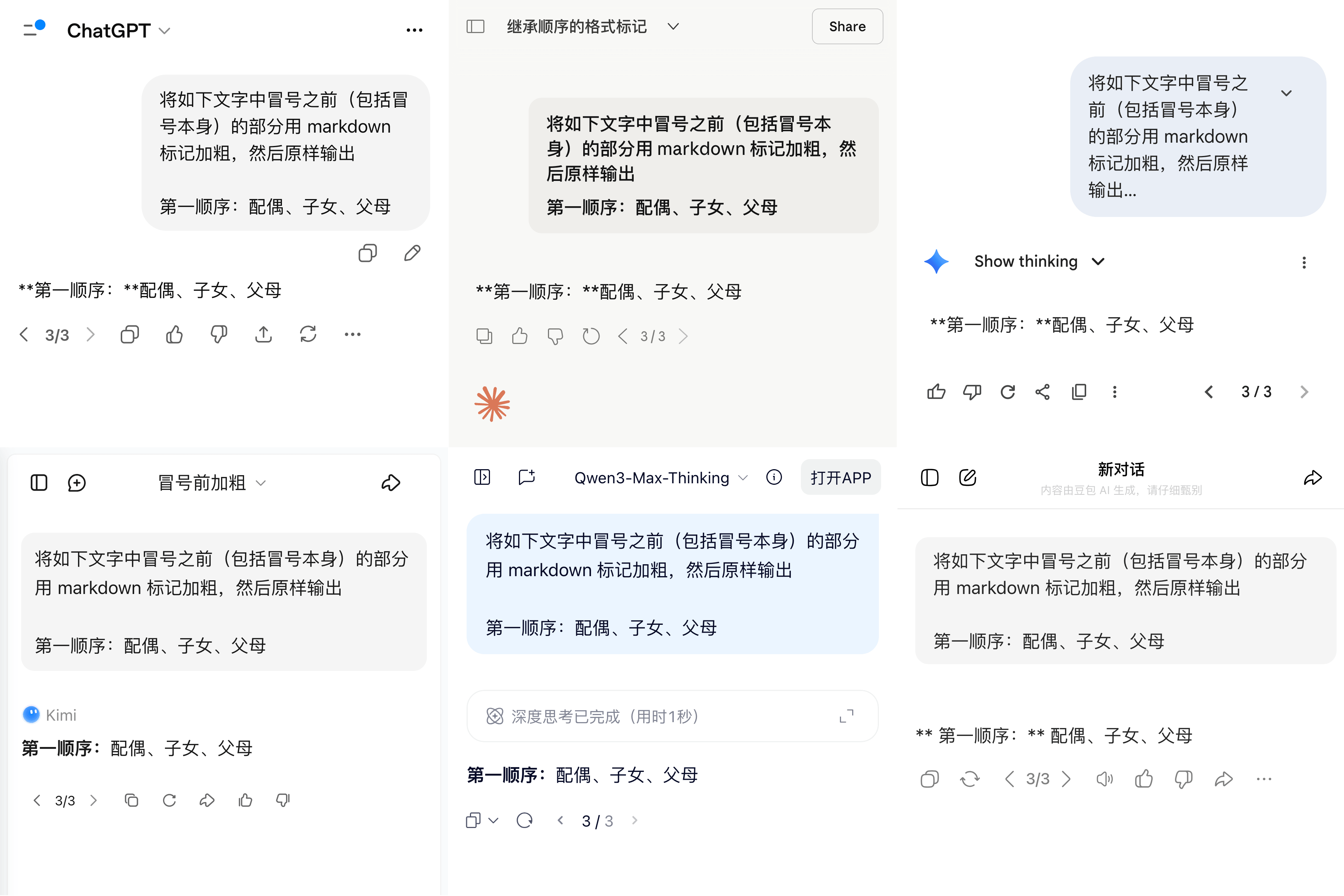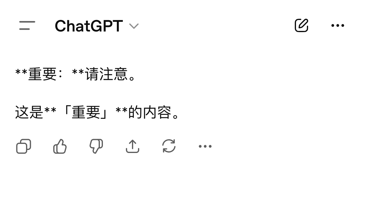 这样,原本不构成贴合的强调标记,由于空格的加入就成为贴合的了。有趣的是,有一些国外模型(特别是 Gemini),可能因为缺乏中文训练,会强迫症般地在中文冒号甚或句号后面加一个空格,导致输出结果「误打误撞」地可以正确加粗。(这也是一个识别 AI 生成文本的实用技巧。)