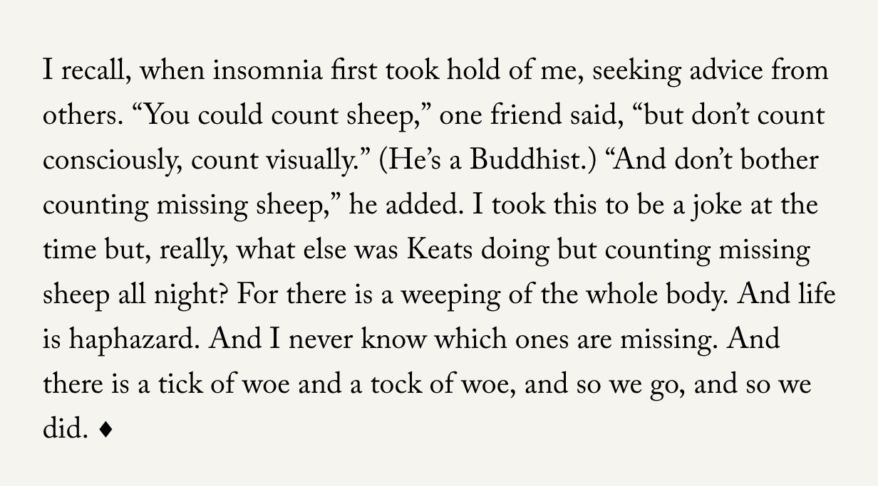as i’m counting the 4th (5th?) sleep pattern in 1.5 yr i’ve come to reconcile with that it’s the kind of thing that is more an emergence than a prescription; that it can neither fail me nor i it; and that as long as i wake up tmrw i will not thinking much about the swings, up or down (mutatis mutandis same for other issues)