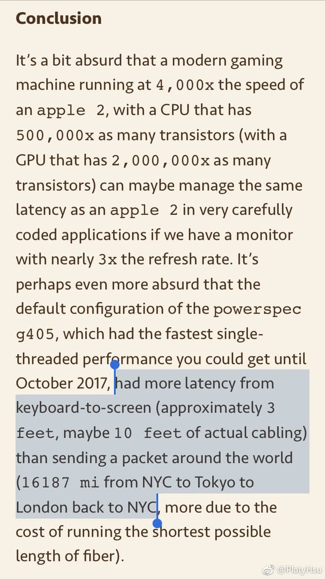 看到 danluu 上一篇文章吐槽电脑今不如昔 键盘输入的延迟 比他从纽约发一个数据包借道东京绕地球一周回到纽约的时间还长
