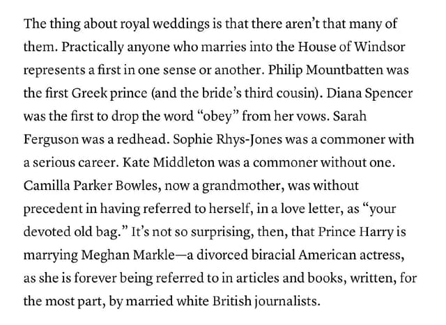 就这第一段我就笑了一分钟 | Prince Harry, Meghan Markle, and Royal Romance https://www.newyorker.com/magazine/2018/05/21/prince-harry-meghan-markle-and-royal-romance