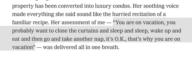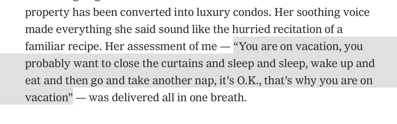 “You are on vacation, you probably want to close the curtains and sleep and sleep, wake up and eat and then go and take another nap, it’s O.K., that’s why you are on vacation.” | There Is No Reason to Cross the U.S. by Train. But I Did It Anyway. - The New York Times https://www.nytimes.com/interactive/2019/03/20/magazine/train-across-america-amtrak.html
