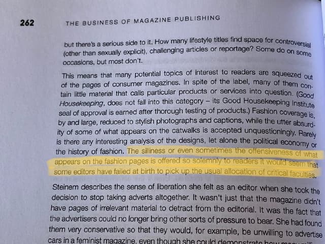 “The silliness or even sometimes the offensiveness of what appears on the fashion pages is offered so solemnly to readers it would seem that some editors have failed at birth to pick up the usual allocation of critical faculties.”