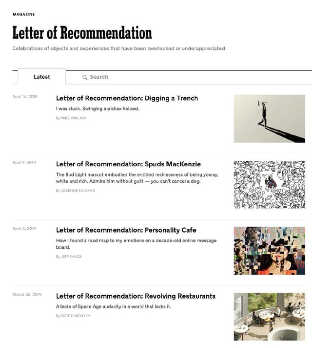 NYT Mag 这个叫「推荐信」的专栏真的是名字和角度都很有意思了 自己说是“celebrations of objects and experiences that have been overlooked or underappreciated” 实际上是“celebrations of unspeakable experiences by appreciating objects”