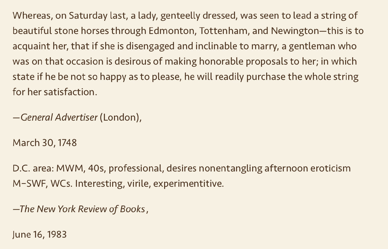 Lonely Hearts - Personal ads from the past two hundred years. | Lapham’s Quarterly https://t.cn/AiWaqZ1m List of single-letter abbreviations | Personal advertisement - Wikipedia https://en.wikipedia.org/wiki/Personal_advertisement