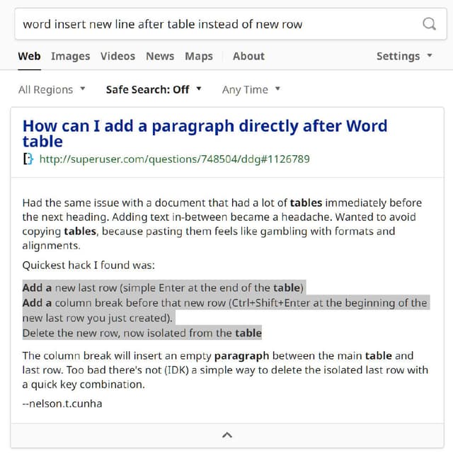 说实话,StackOverflow 这种「你想得到和想不到的问题都有人问过并且被回答过」的能力每次都让我很惊讶 当然,Word 这种「你想得到和想不到的问题都会出现」的体质更让我惊讶 请问你们的用户上辈子做错了什么 要动不动考虑「怎么在两个表格之间插入空行」这种沙雕问题?