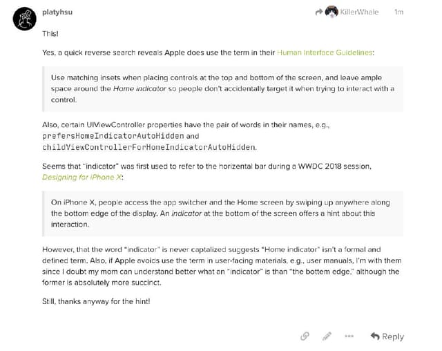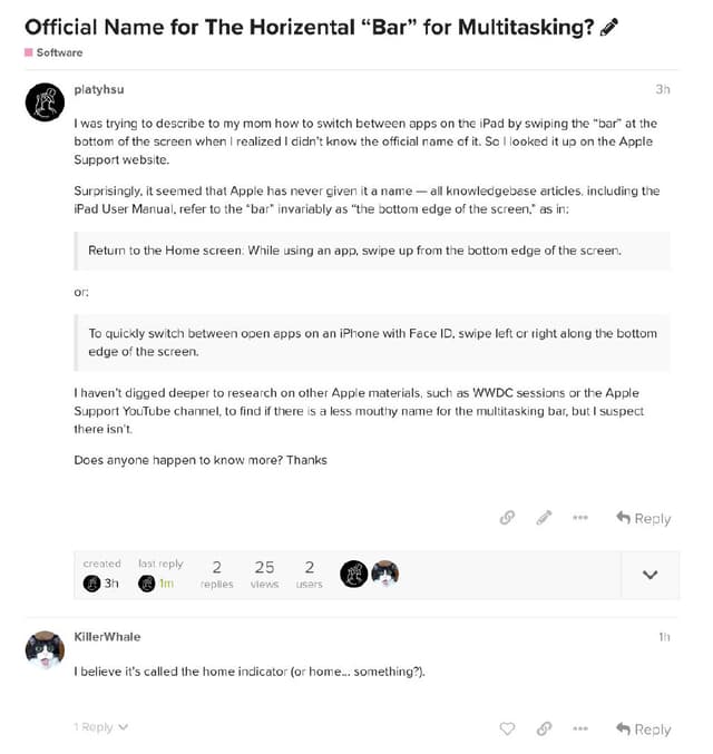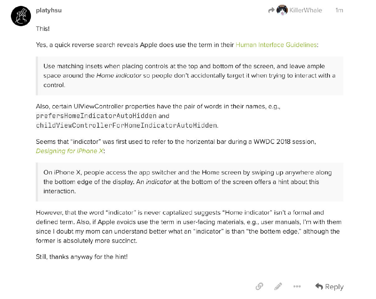 突然发现自己不知道 iPhone 底下那个切换 app 的横条官方名字叫什么,跑去翻了支持网站发现苹果自己也是管它叫「屏幕底部边缘」,心想这算个啥名字就去 MPU 论坛上(强烈推荐这个播客附属社区)发帖问了下