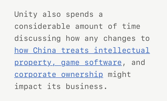 Unity also spends a considerable amount of time discussing how any changes to how China treats intellectual property, game software, and corporate ownership might impact its business.