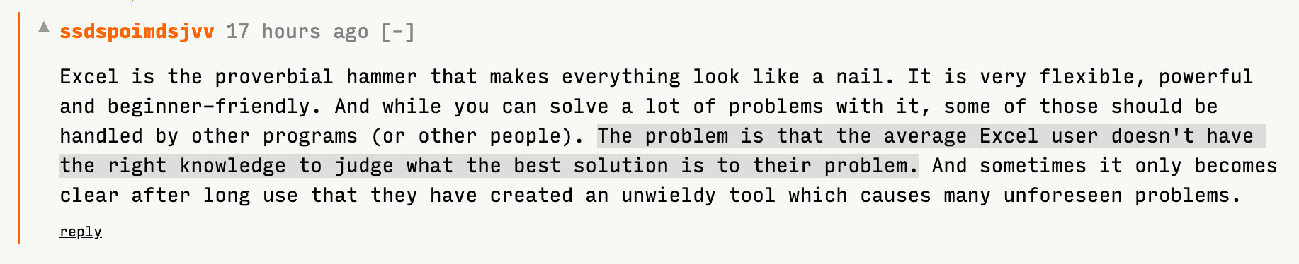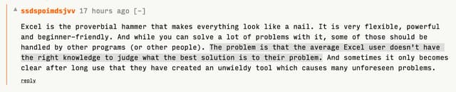 Excel is the proverbial hammer that makes everything look like a nail. […] The problem is that the average Excel user doesn't have the right knowledge to judge what the best solution is to their problem.