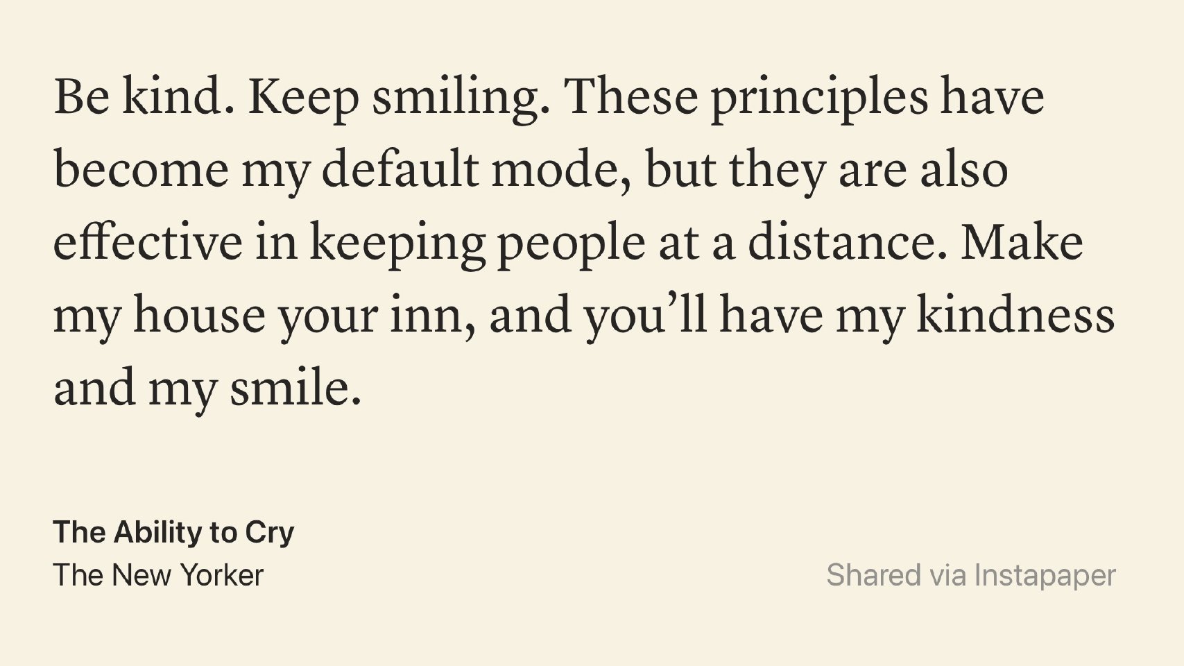 Be kind. Keep smiling. These principles have become my default mode, but they are also effective in keeping people at a distance. Make my house your inn, and you’ll have my kindness and my smile.