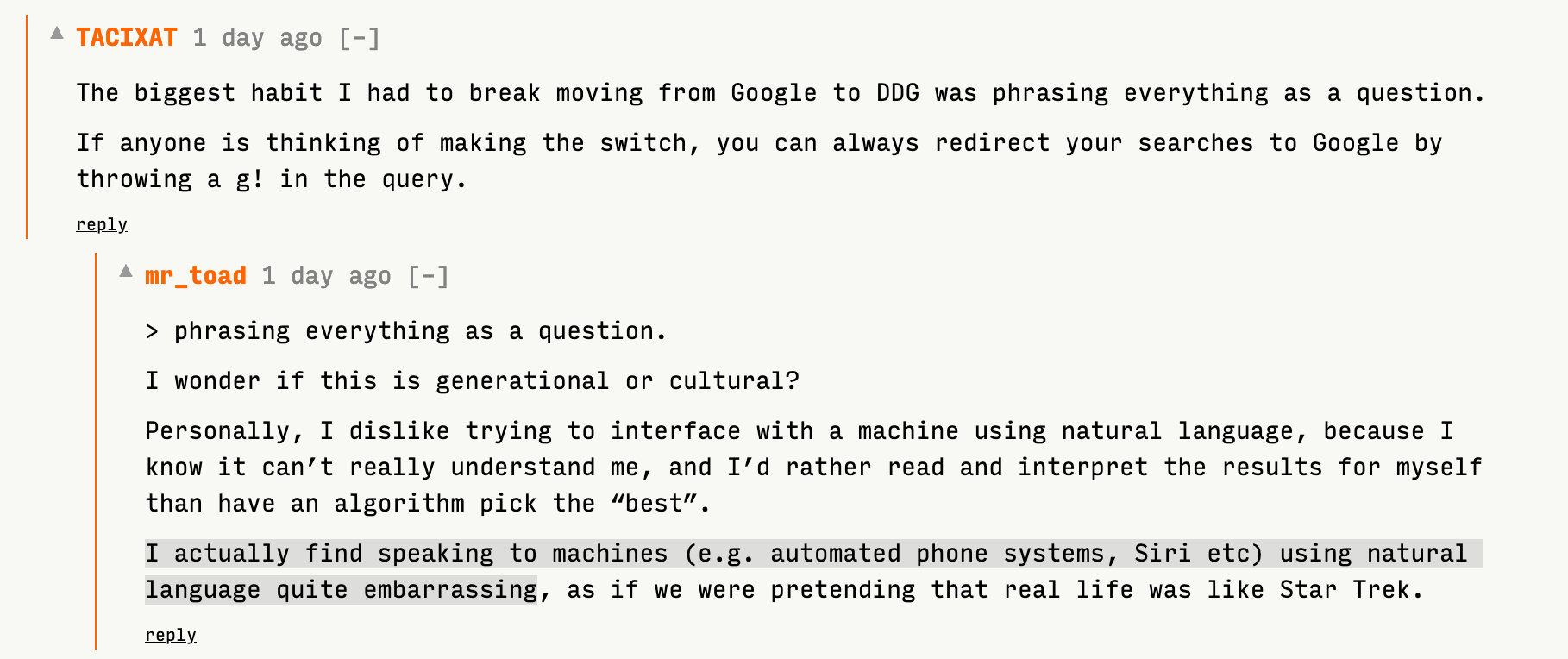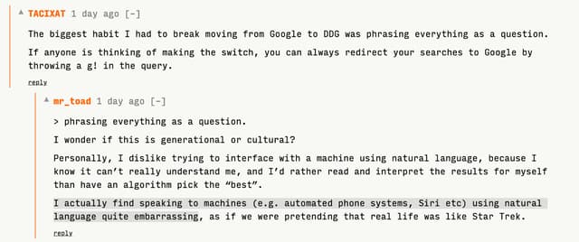 也是最让我感到数字世界代差的区别之一 我(可能是顽固不化地)始终难以接受往搜索框里输入一句完整的疑问句
