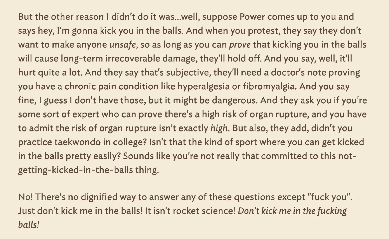 No! There's no dignified way to answer any of these questions except "fuck you". Just don't kick me in the balls! It isn't rocket science! Don't kick me in the fucking balls!