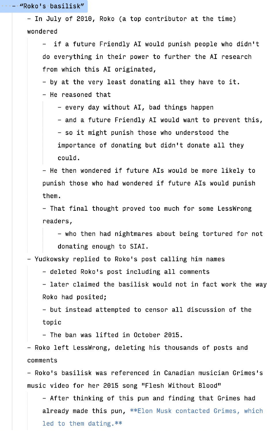 “Roko's basilisk” […] reason[s] every day without AI, bad things happen and a future Friendly AI would want to prevent this, so it might punish those who understood the importance of donating but didn't donate all they could. Roko's basilisk was referenced in Canadian musician Grimes's music video for her 2015 song "Flesh Without Blood" […]. After thinking of this pun and finding that Grimes had already made this pun, Elon Musk contacted Grimes, which led to them dating.