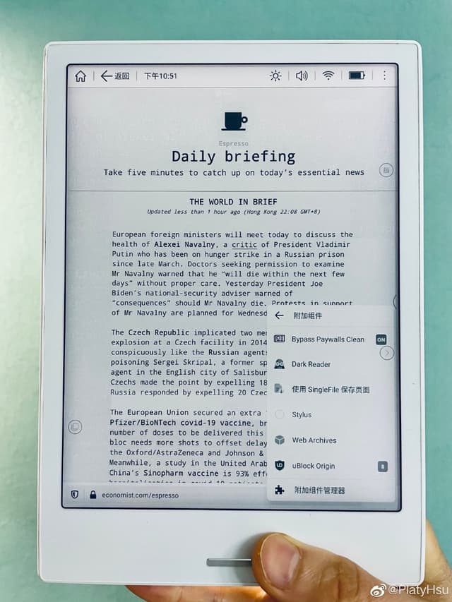 虽然我没什么资质推荐安卓应用,但还是吹一下这个叫 Iceraven 的魔改版 firefox,默认启用扩展支持、删掉 mozilla 那些有的没的,在 eink屏上搭配插件 Singlepage(保存带图的完整网页,方便用 KOReader 打开当书看)、Darkreader(本职工作是暗黑模式,但也可以反过来用来强制提高对比度和纯白底黑字)、stylus(把花里胡哨的 webfont 改成简单粗暴的等宽字体)、uBlock0(不用介绍了)以后体验好到起飞