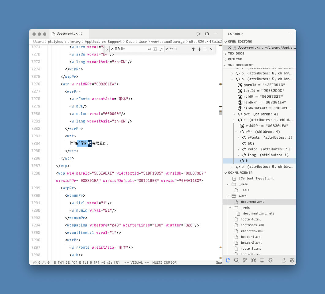 最近但凡要基于一个模板改协议的,我第一步都是用 VS Code + OOXML Viewer 直接拆了 docx 去改里面的 document.xml,滚动条匹配高亮 + RegExp + Vim 键位改起定义和简称不要太爽(相对的,打工整体还是很不爽)