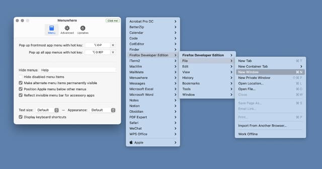 Moom 的开发者新出了一个小工具 Menuwhere [1],主要功能是把菜单栏「搬」到鼠标指针位置。开发者宣传的主要好处是 (a) 在大屏幕上省去跋山涉水去点菜单栏的距离和 (b) 方便键盘操作。但是:对于 (a),如一些评论指出,由于 macOS 有指针移动的加速度,长距离移动指针并不更费时间;对于 (b),仅仅复刻菜单栏并不足以体现键盘操作优势(例如还是需要用方向键在多层菜单中定位),Paletro(甚至自带的 ⇧⌘/
