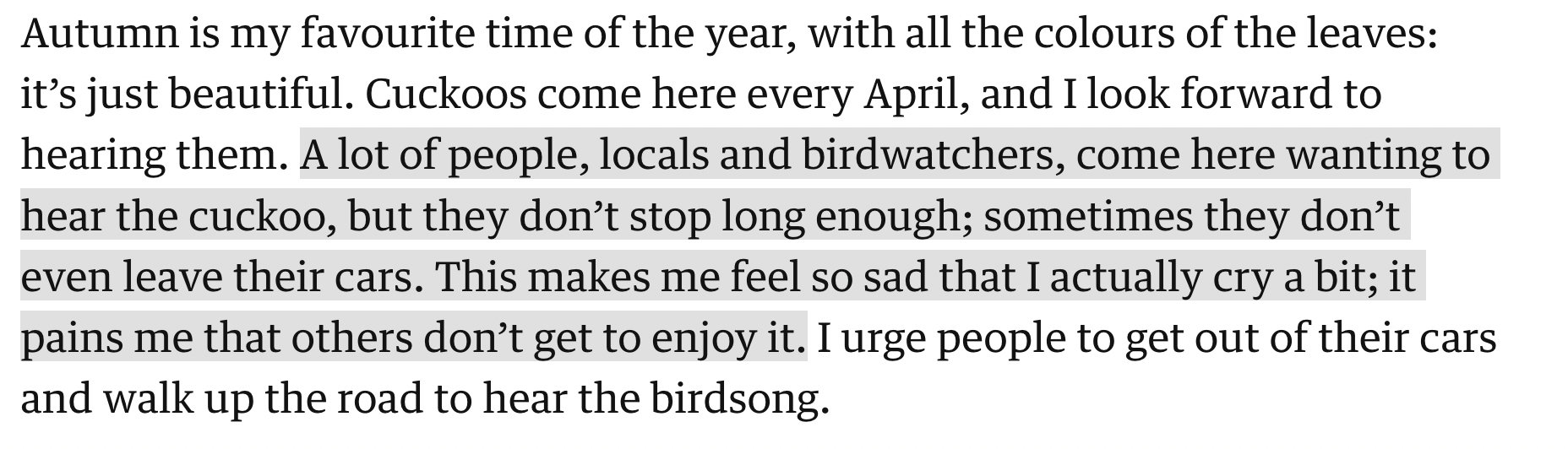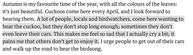 A lot of people, locals and birdwatchers, come here wanting to hear the cuckoo, but they don’t stop long enough; sometimes they don’t even leave their cars. This makes me feel so sad that I actually cry a bit; it pains me that others don’t get to enjoy it.