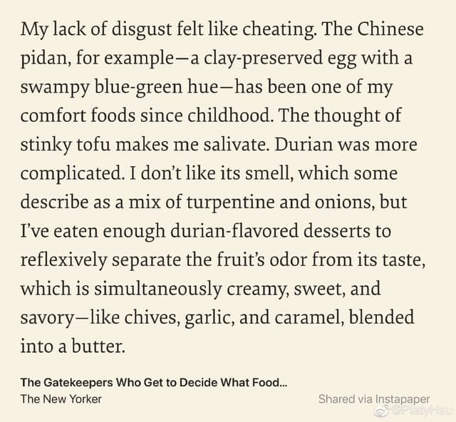 The Gatekeepers Who Get to Decide What Food Is “Disgusting” https://t.cn/A6VAXJRg 在接受了奶酪以后我回来发现我开始对原来毫无兴趣的豆腐乳也觉得真香了🤦🏿♀️