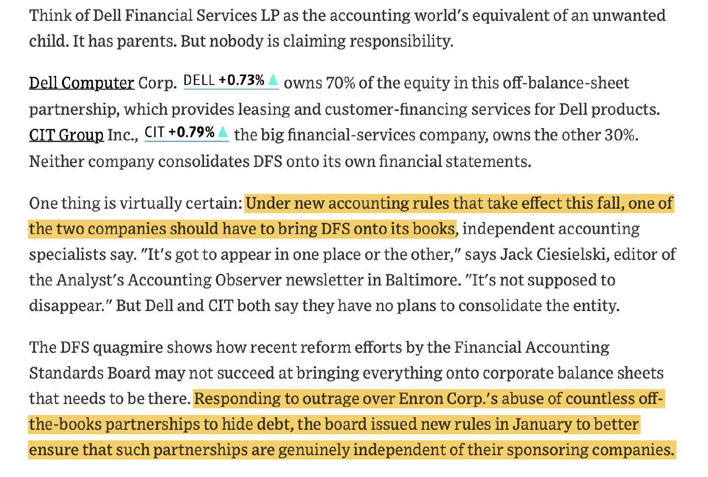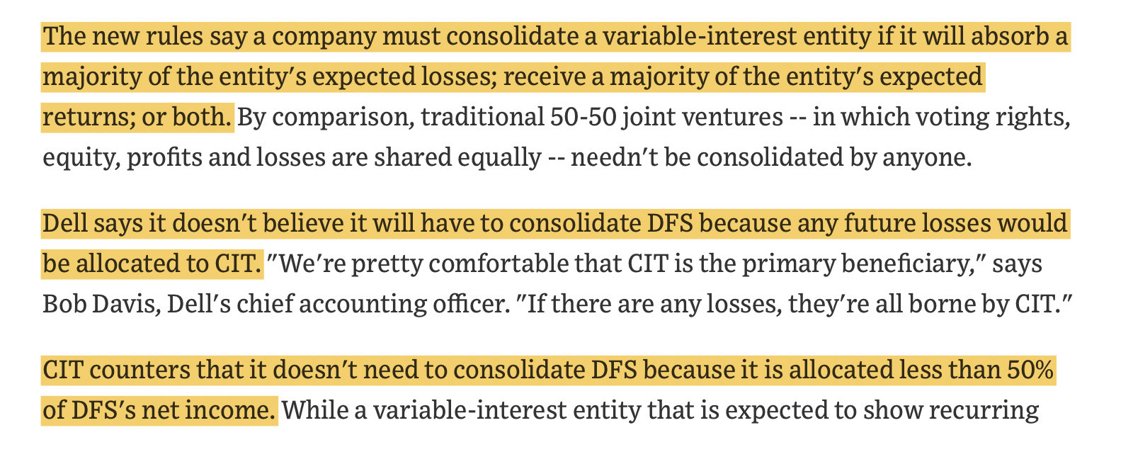 由于 VIE 已经被中国公司玩坏了,翻出来一篇 VIE 会计规则刚出来那会 WSJ 的报道,剧情读起来竟然有些魔幻:FASB 表示安然那种乱下蛋亏损也不记账的路子太野了,让爸爸发明一个 VIE 来治治你们;戴尔和合资方听说后纷纷踢皮球说表示千万别把 VIE 并表给我