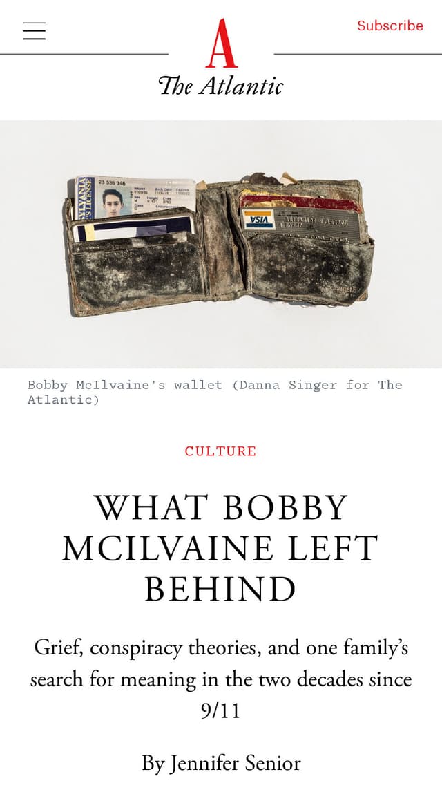 大西洋月刊被推得多的热文有时候比较水,但这期写 911 遗属家庭的这篇是凭实力成爆款,金句停不下来的那种,冷饭选题被文笔救活的例子 www.theatlantic.com/magazine/archive/2021/09/twenty-years-gone-911-bobby-mcilvaine/619490/
