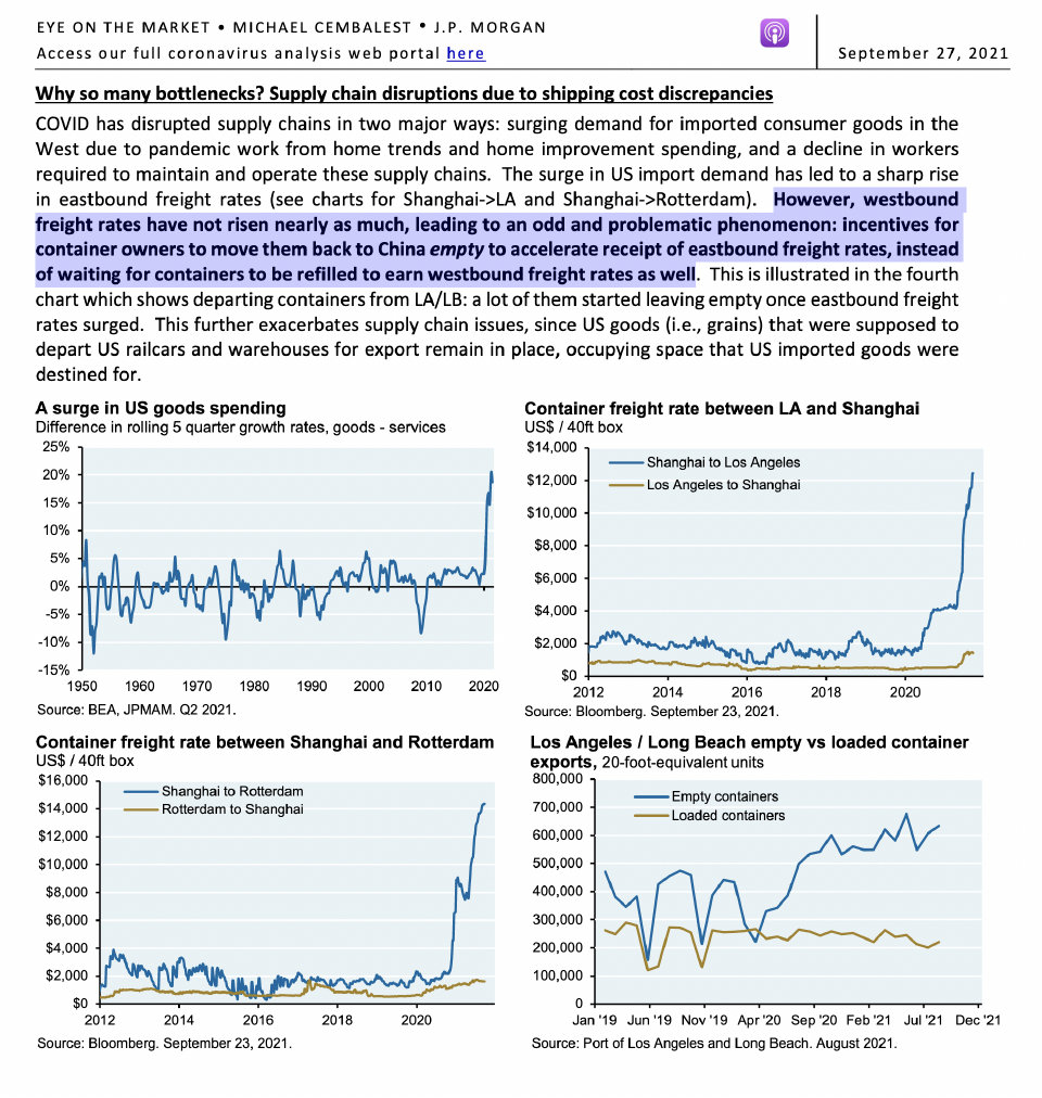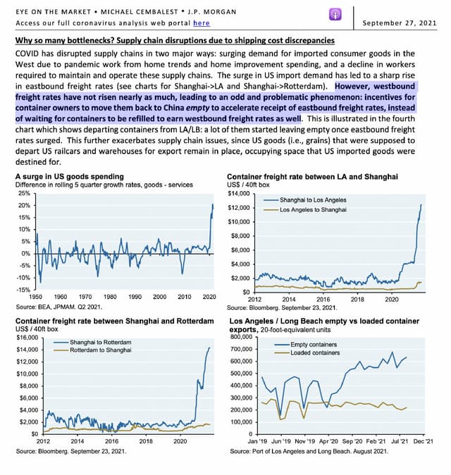 「然而,西行运费几乎没有上涨多少,导致了一种吊诡且棘手的现象:集装箱主有动机将集装箱空载运回中国,好加快收到东行运费,而不是等重新装箱以后再一起挣到西行运费。」