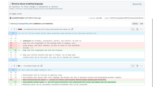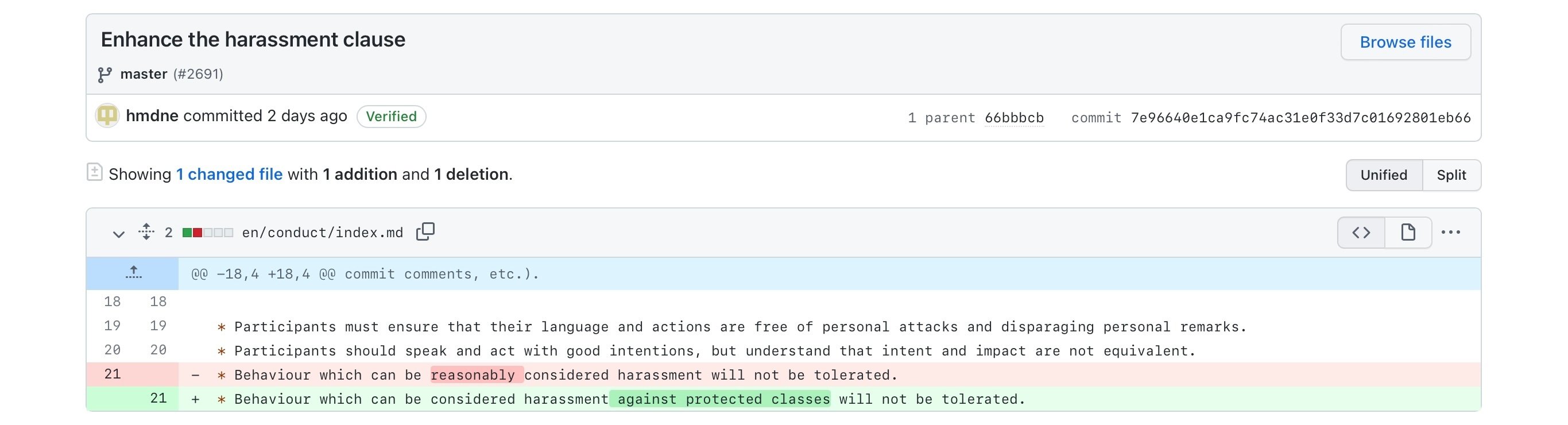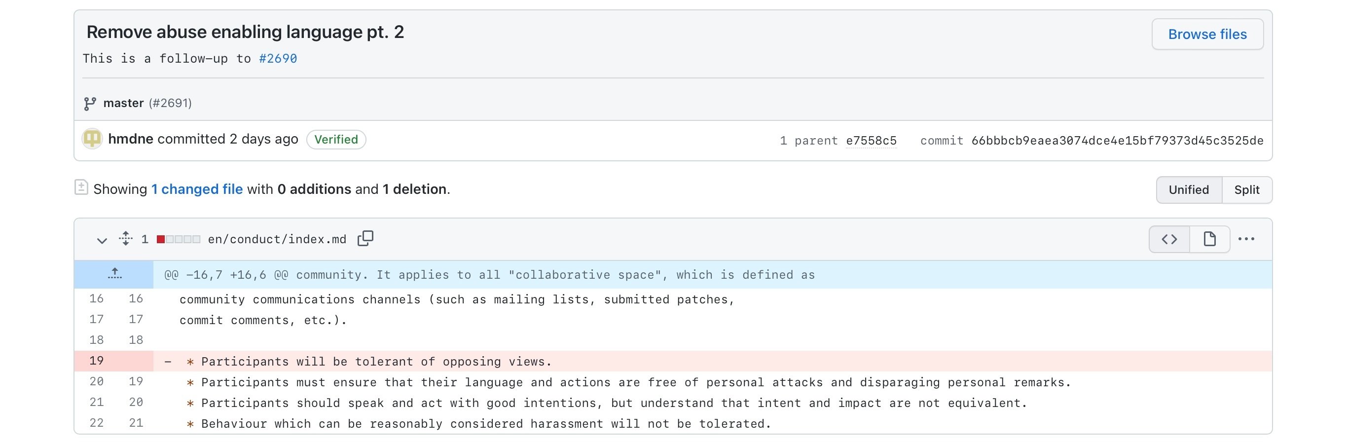 wokeness 的风吹到开源项目了 维护者加上这种规则的时候有没想过 protected class 本身还是个美国中心的概念?看谁不爽就赶走就可以 inclusive 了吗?就算假定这么改是出于正义感 噢原来自己把 assume good intention 也删了