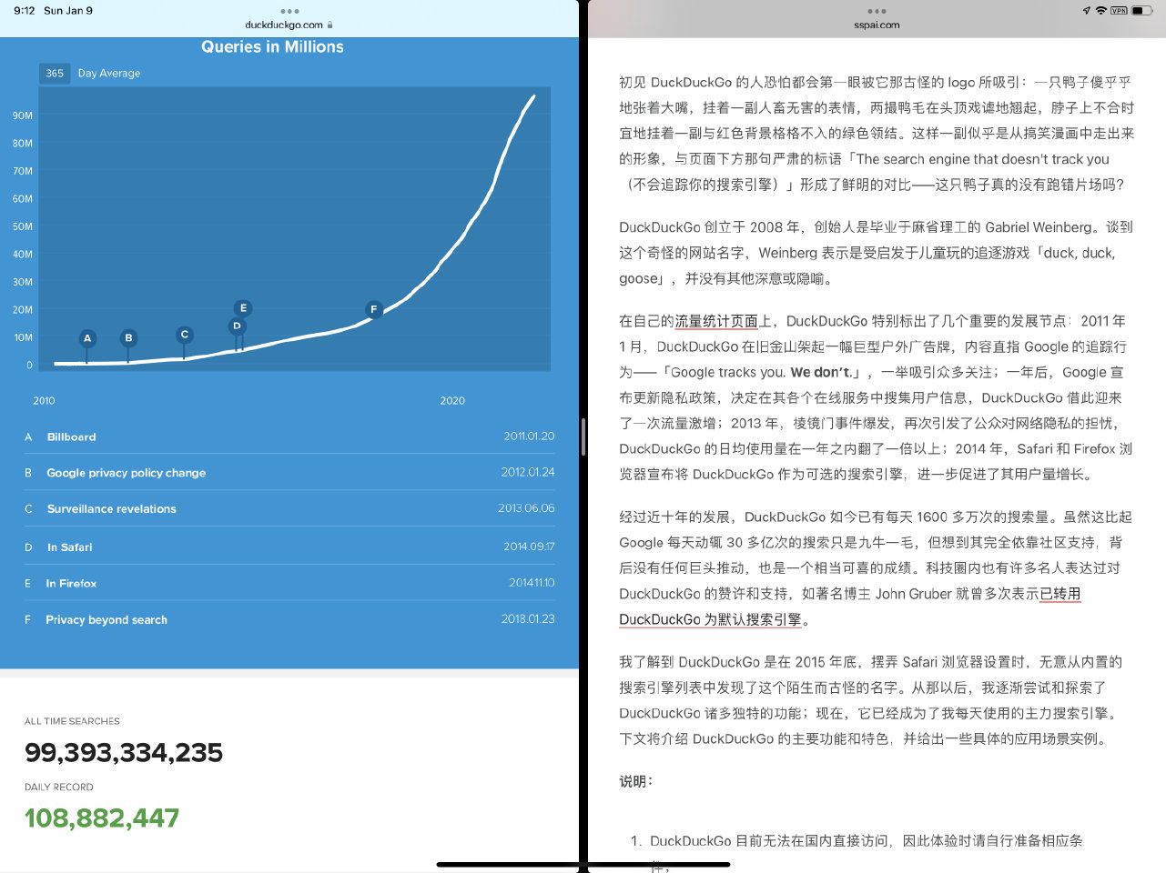 鸭鸭走发了去年的流量数据,四年半之前写这玩意的时候还是每天 1600 万次 现在已经一亿次左右了(然后发现我这小破文章竟然也被翻了 16 万多次🥲) 这几年都是当作默认搜索引擎在用 英文搜索基本已经替代 Google 了 中文搜索还是搜十次有十次会出现 NSFW 所以没法用(但如果你对自己的心理健康有任何关爱搜中文内容本来就应该直接用垂直搜索) 最大的抱怨仍然是那个鸭子图标太丑了 以至于我专门有一条去广告规则是把它屏蔽掉 http://t.cn/RKggTXU