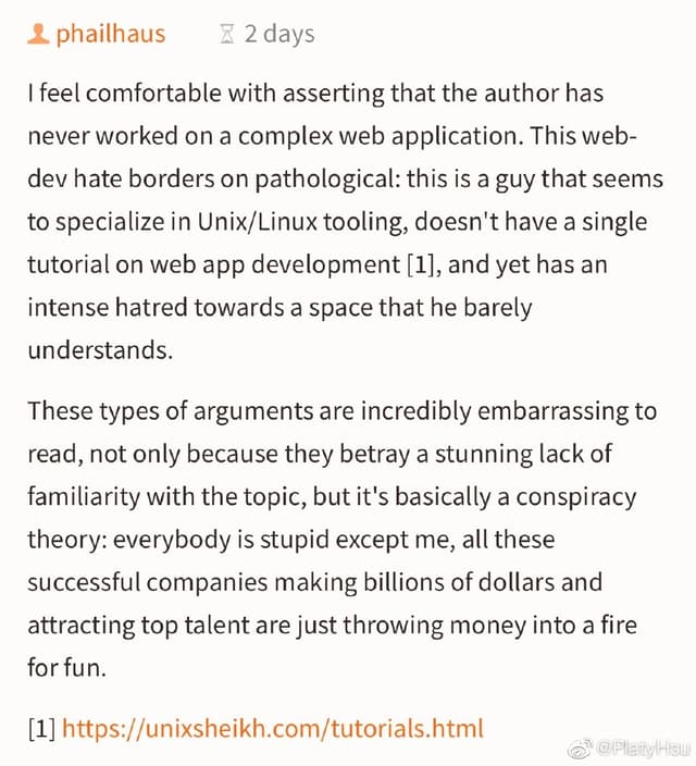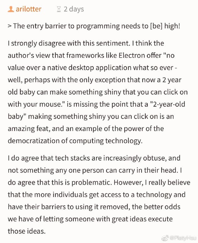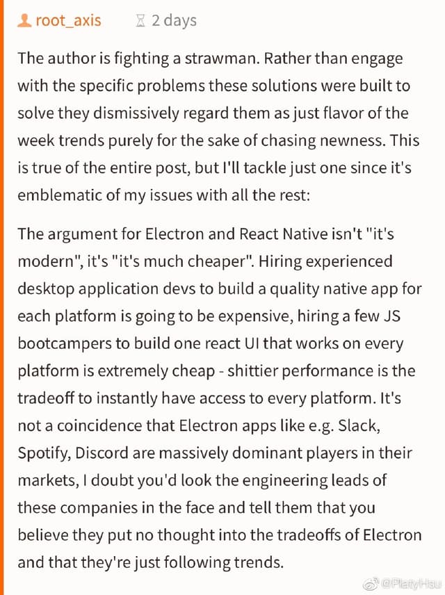 这好像是印象里第一次在 Hacker News 上看到对于「Electron 该不该死」这个圣战话题,反套壳派不仅没有在前排评论占上风,而且被挺套壳派吊起来指着鼻子骂老东西你懂个屁。可能船确实正在或者已经开走了吧 ……