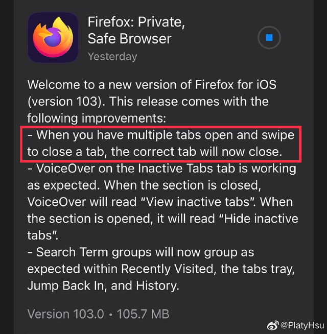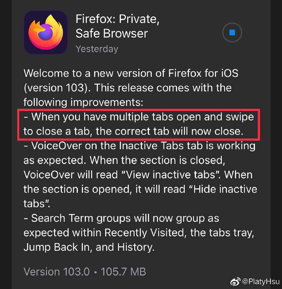 Firefox iOS 版有多扶不起来,堂堂一个整数版本更新,排名第一的新功能:滑动关闭标签页现在可以关闭正确的标签页了!那你真的很棒棒耶!