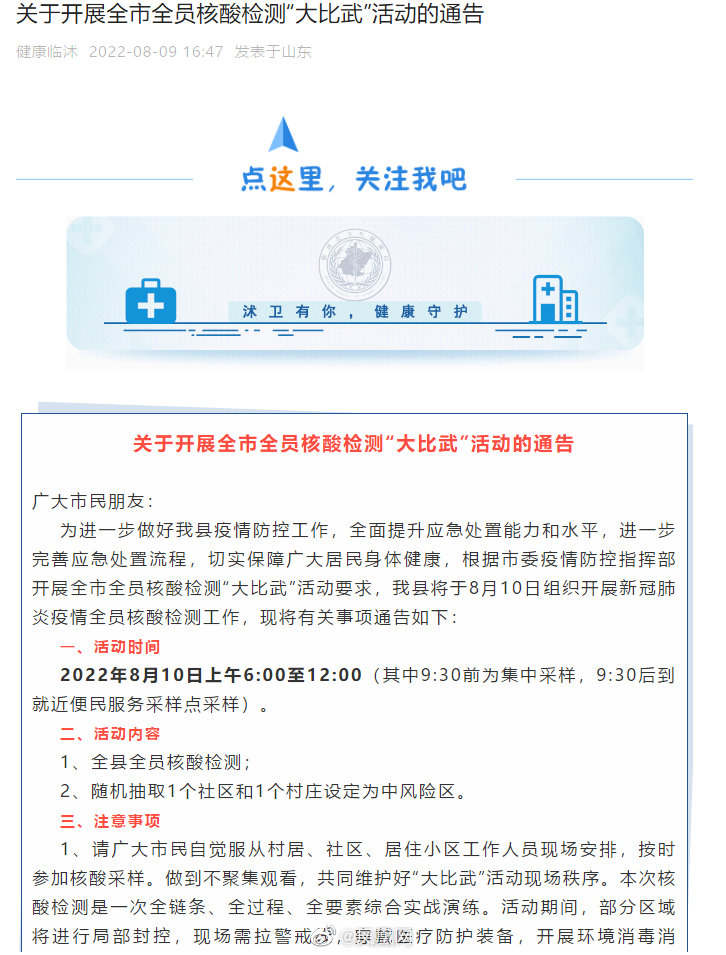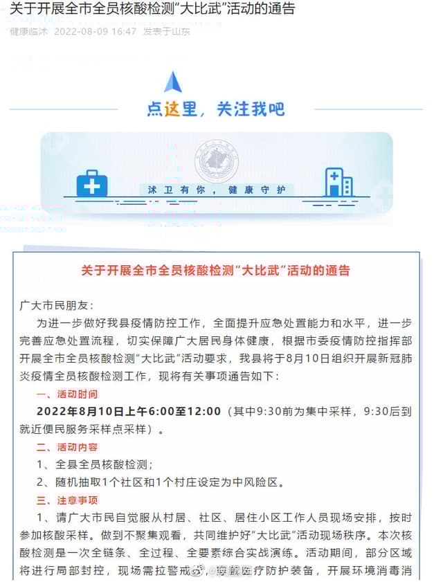 山东临沭开展全员核酸检测“大比武”:随机抽取1个社区和1个村庄设定为中风险据健康临沭消息,为进一步做好县疫情防控工作,全面提升应急处置能力和水平,进一步完善应急处置流程,切实保障广大居民身体健康,根据市委疫情防控指挥部开展全市全员核酸检测“大比武”活动要求,我县将于8月10日组织开展新冠肺炎疫情全员核酸检测工作,现将有关事项通告如下: 一、活动时间 据健康临沐消息,2022年8月10日上午6:00至12:00(其中9:30前为集中采样,9:30后到就近便民服务采样点采样)。 二、活动内容 1、全县全员核酸检测; 2、随机抽取1个社区和1个村庄设定为中风险区。 三、注意事项 1、请广大市民自觉服从村居、社区、居住小区工作人员现场安排,按时参加核酸采样。做到不聚集观看,共同维护好“大比武”活动现场秩序。本次核酸检测是一次全链条、全过程、全要素综合实战演练。活动期间,部分区域将进行局部封控,现场需拉警戒线,穿戴医疗防护装备,开展环境消毒消杀,相关车辆和人员向检测区域集结,请广大居民不必恐慌,保持正常的工作和生活秩序。 2、请参与“大比武”活动的人员做好个人防护、佩戴口罩,听从现场指挥,自觉排队,遵守秩序。 3、“大比武”活动期间,不要对活动场景进行非法传播,不拍照录像,不在微信、微博等社交媒体平台随意转发活动现场相关图片、视频,避免造成不良社会影响。做到不造谣、不传谣、不信谣。对恶意传播不实图片、不实视频和散布谣言者,将依法追究相关法律责任。 疫情防控人人有责,因“大比武”活动给广大居民朋友的出行、工作和生活带来的不便,敬请谅解!感谢您的支持和配合!http://t.cn/A6SZ1eGt