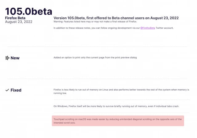 火狐终于开窍要修好另一个触摸板相关的老毛病了:网页在放大状态下,上下滚动触摸板会自动忽略左右的轻微位移(因为手指不可能严格上下滚动的),保证长文之类的主体部分不左右乱晃,这个问题表面上渺小到都没法舌头不打结地描述出来,但就是能用和不能用的差别