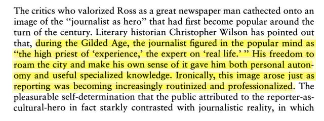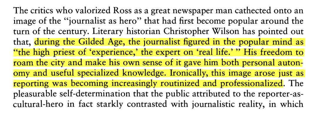在镀金时代,记者在大众心目中被视为掌握「经验」的大祭司,「现实生活」的专家。他自由地漫游在城市中,自主地感知城市,这同时赋予了他个体自主性和有用的专业知识。具有讽刺意味的是,记者这种形象的建立,正值报道越发变成一种循规蹈矩和职务行为之时。