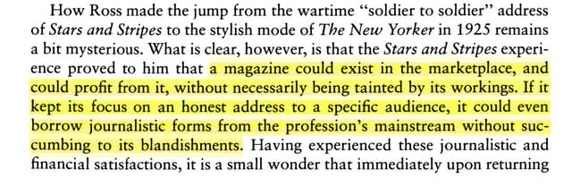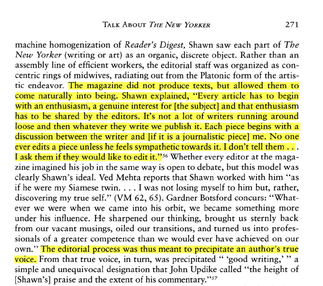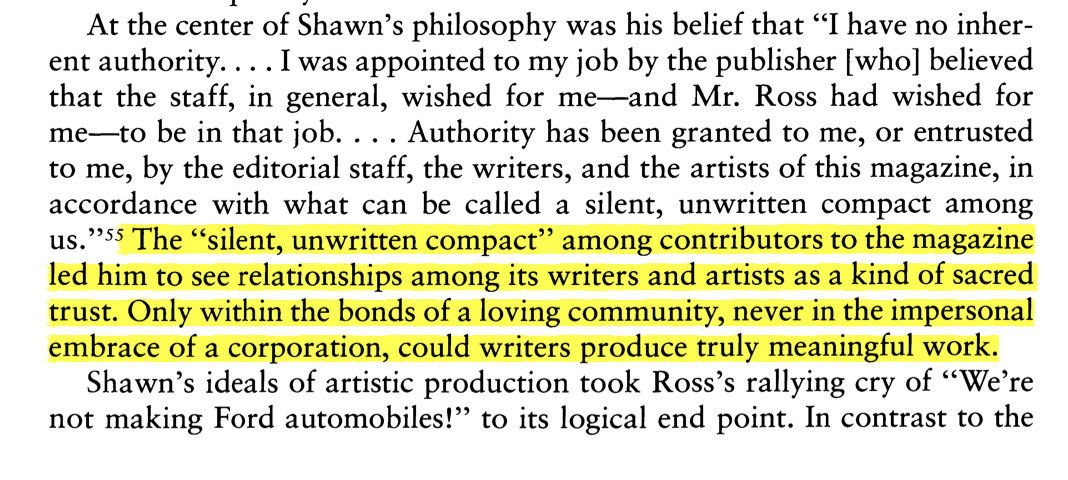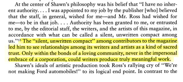 供稿人之间「沉默的、不成文的契约」让他将杂志的作者和艺术家之间的关系视为一种神圣的信任。只有在一个充满热爱的社区纽带内,而不是在一个无人性组织的裹挟中,作家才能创作出真正有意义的作品。