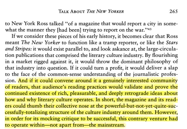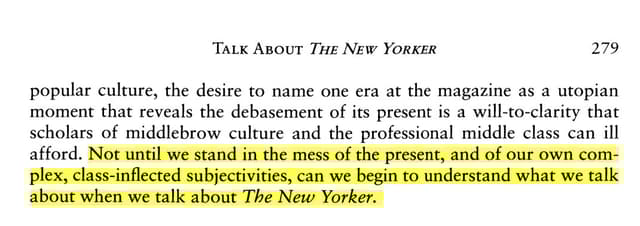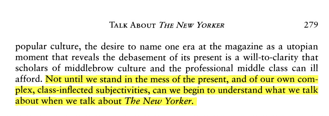 只有让自己置身于当下的混乱中,置身于自我那种复杂的、受阶级影响的主观性中,我们才能开始理解,谈论《纽约客》时,我们在谈论什么。