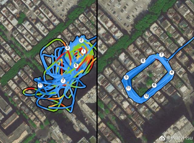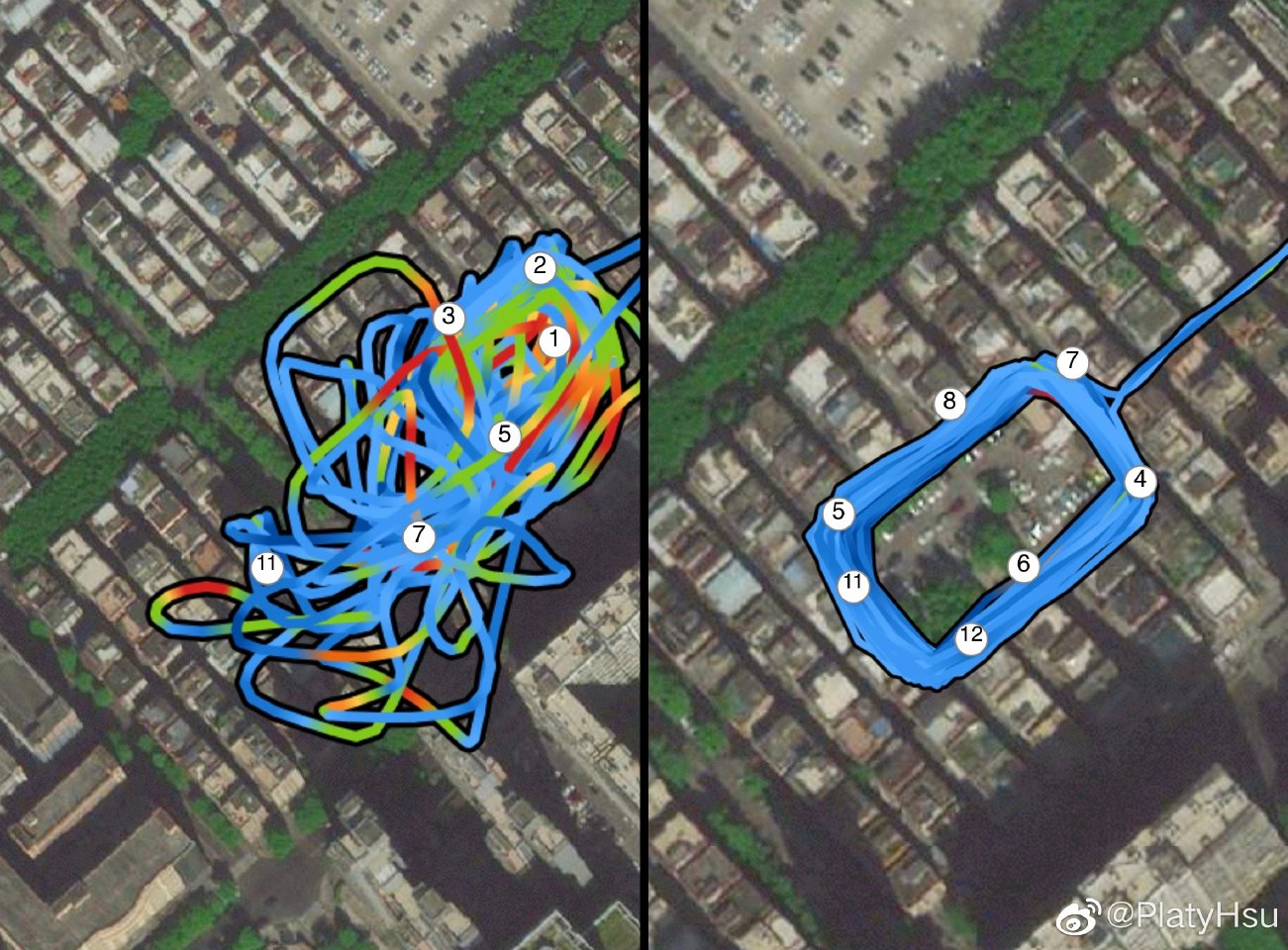 Apple Watch 和佳明(乞丐版 255)在典型弱 GPS(居民区有遮挡停车场)场景下,大致控制了时间距离配速天气,记录的路线对比🙃