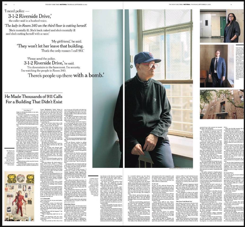 上个月错过了,偶尔看到人安利发现真的很好看 The Mystery Behind the Crime Wave at 312 Riverside Drive - The New York Times https://www.nytimes.com/2022/09/14/nyregion/nyc-911-calls-riverside-drive.html