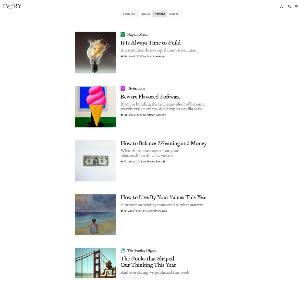 看起来 every.to 的高价 business newsletters bundle 的模式也搞不下去了,现在基本上自己拆掉了所有付费墙,主要内容变成了 self promotion、productivity/startup guru 客座文章(兼植入)加一些鸡汤,含水量从五篇有一篇水变成五篇有一篇不水