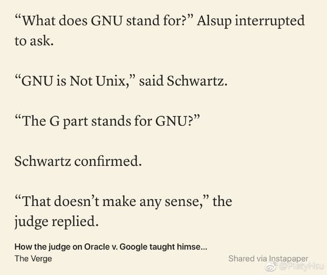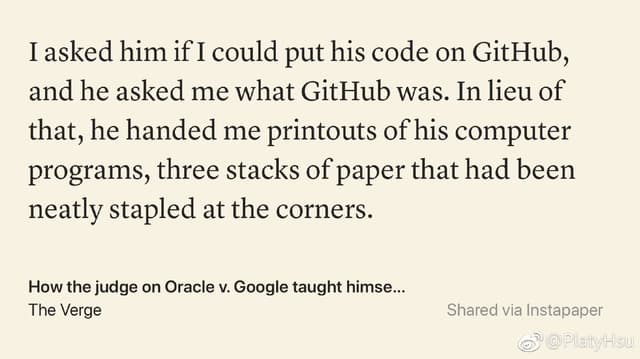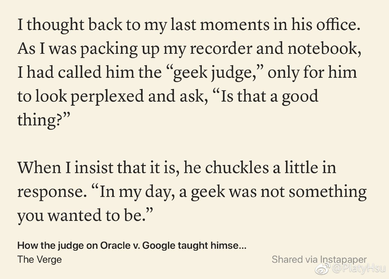 这法官太可爱了吧 [跪了]| How the judge on Oracle v. Google taught himself to code - The Verge https://t.cn/RWvtYzq