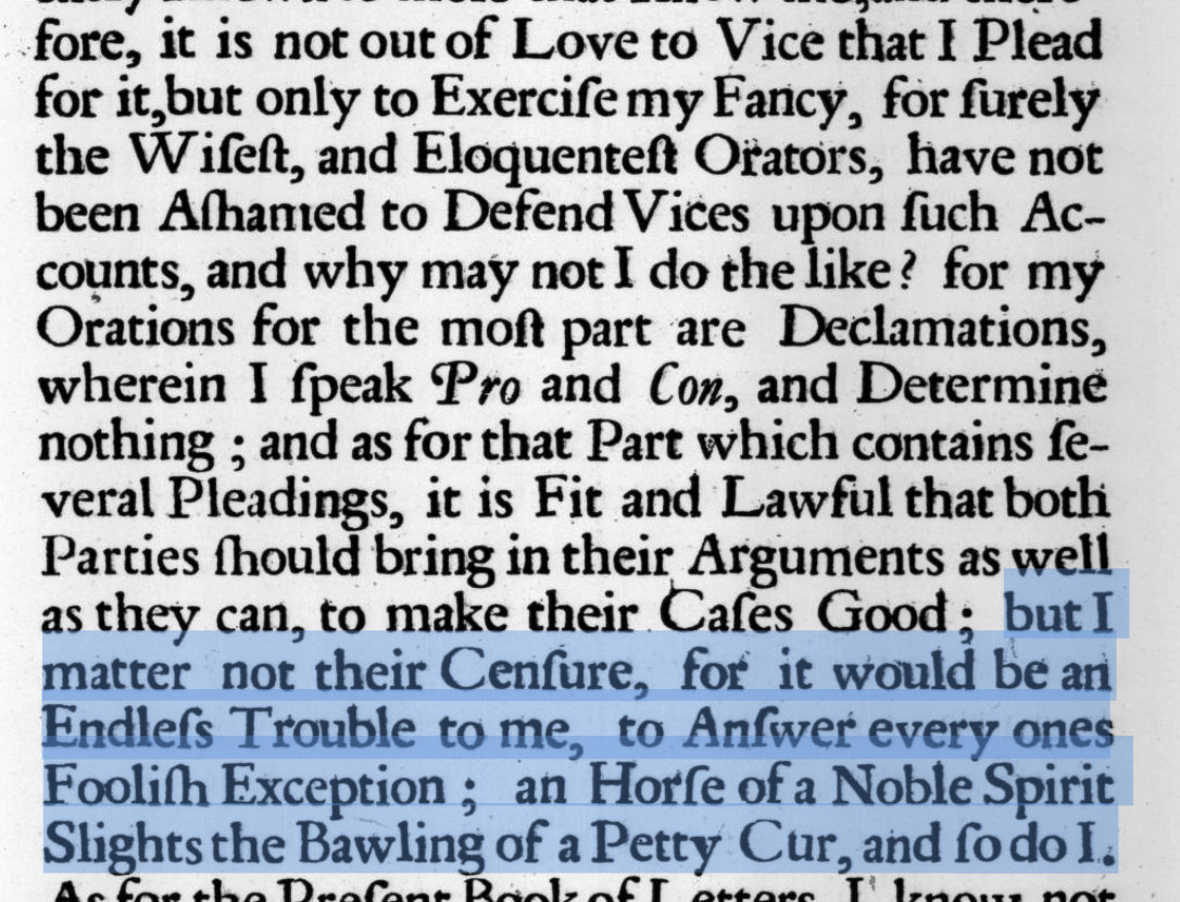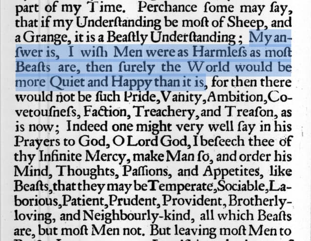 I matter not their Censure, for it would be an Endless Trouble to me, to Answer every ones Foolish Exception; an Horse of a Noble Spirit Slights the Bawling of a Petty Cur, and so do I. I wish Men were as Harmless as most Beasts are, then surely the World would be more Quiet and Happy than it is, for then there would not be such Pride, Vanity, Ambition, Covetousness, Faction, Treachery, and Treason, as is now. https://archive.org/details/bim_early-english-books-1641-1700_ccxi-sociable-letters-_newcastle-margaret-cav_1664/page/n9/mode/2up