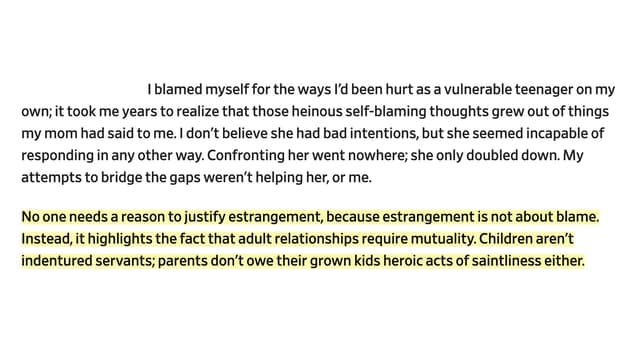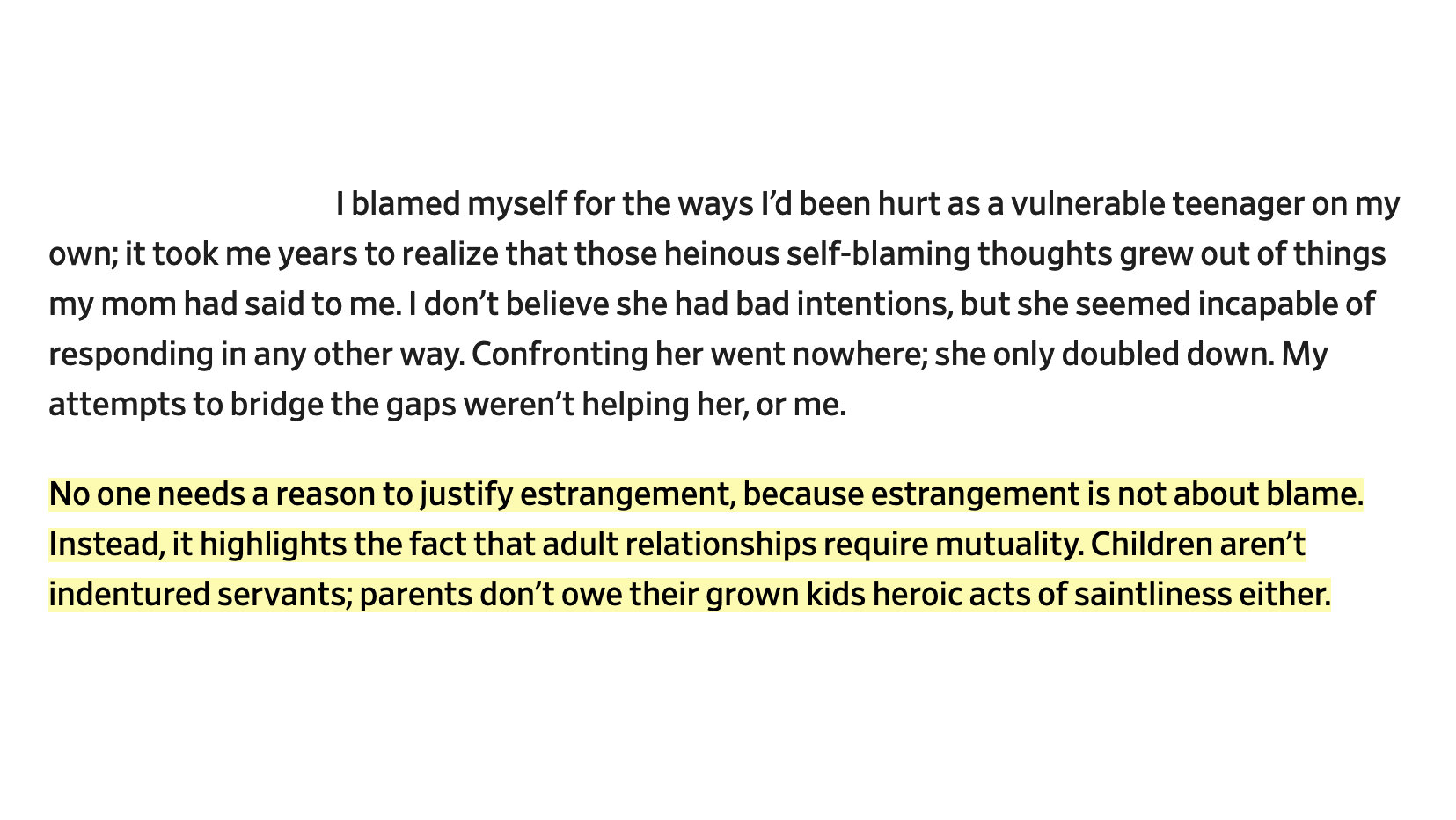 “Children aren’t indentured servants; parents don’t owe their grown kids heroic acts of saintliness either.” https://slate.com/life/2024/08/no-contact-parents-meaning-family-estrangement.html