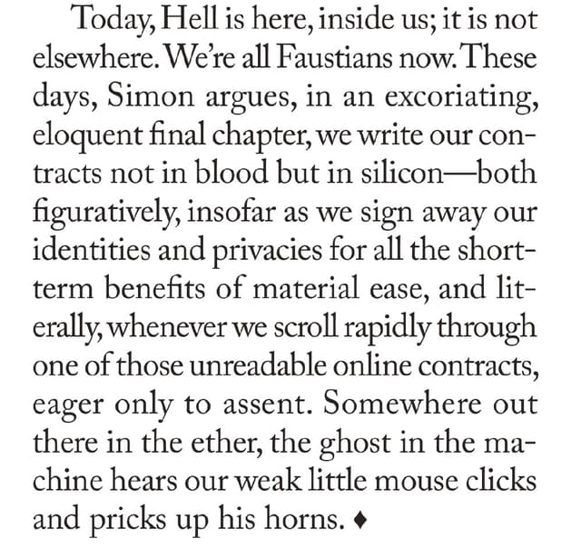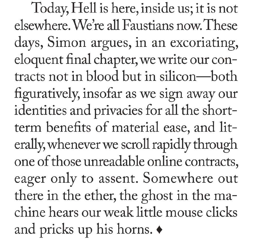如今,地狱就在心中,人们都在效仿浮士德了。[…] 契约不是用血,而是通过芯片签订的。比喻意义上像浮士德,为了短期的物质便利放弃身份和隐私;情节也一字不差,飞速划过读不懂的在线合同,只渴望献出同意。以太中的某处,听到微弱的鼠标点击声,住在机器里的魔鬼竖起了犄角。https://archive.is/iiG7q