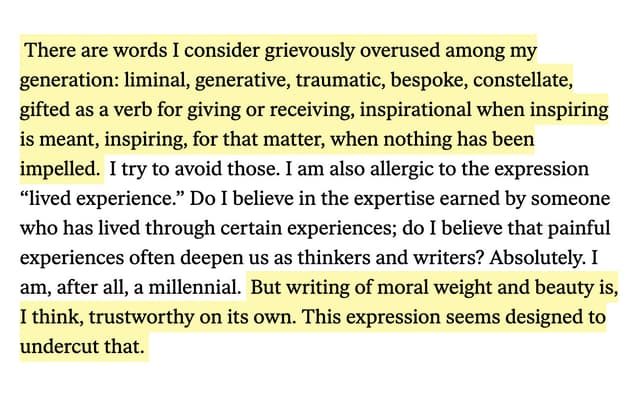 [W]riting of moral weight and beauty is […] trustworthy on its own. This expression [“lived experience”] seems designed to undercut that.