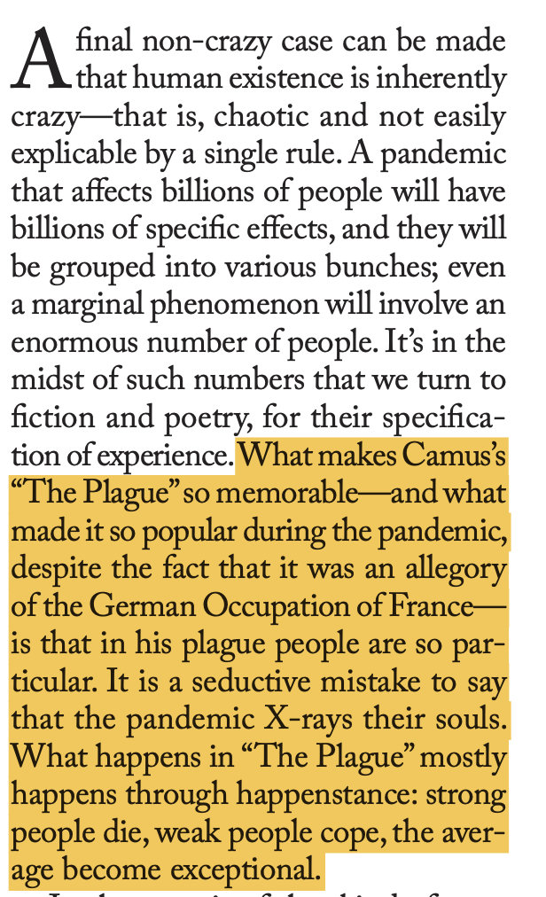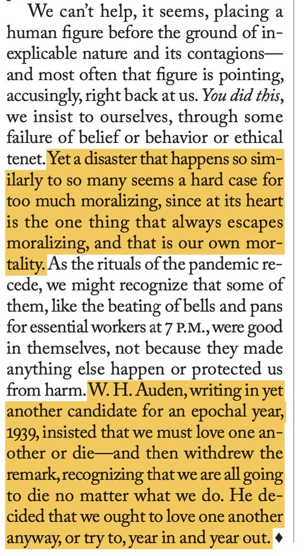 It is a seductive mistake to say that the pandemic X-rays their souls. What happens in “The Plague” mostly happens through happenstance: strong people die, weak people cope, the average become exceptional. W. H. Auden, writing in yet another candidate for an epochal year, 1939, insisted that we must love one another or die—and then withdrew the remark, recognizing that we are all going to die no matter what we do. He decided that we ought to love one another anyway, or try to, year in and year out.