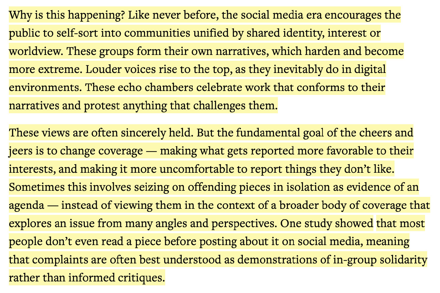 虽然扭腰时报现在网文味实在有点冲,但人家老板这段话单看讲得还是对的 https://www.niemanlab.org/2024/03/mutual-incomprehension-now-exists-seemingly-everywhere-the-new-york-times-publisher-responds-to-its-critics/