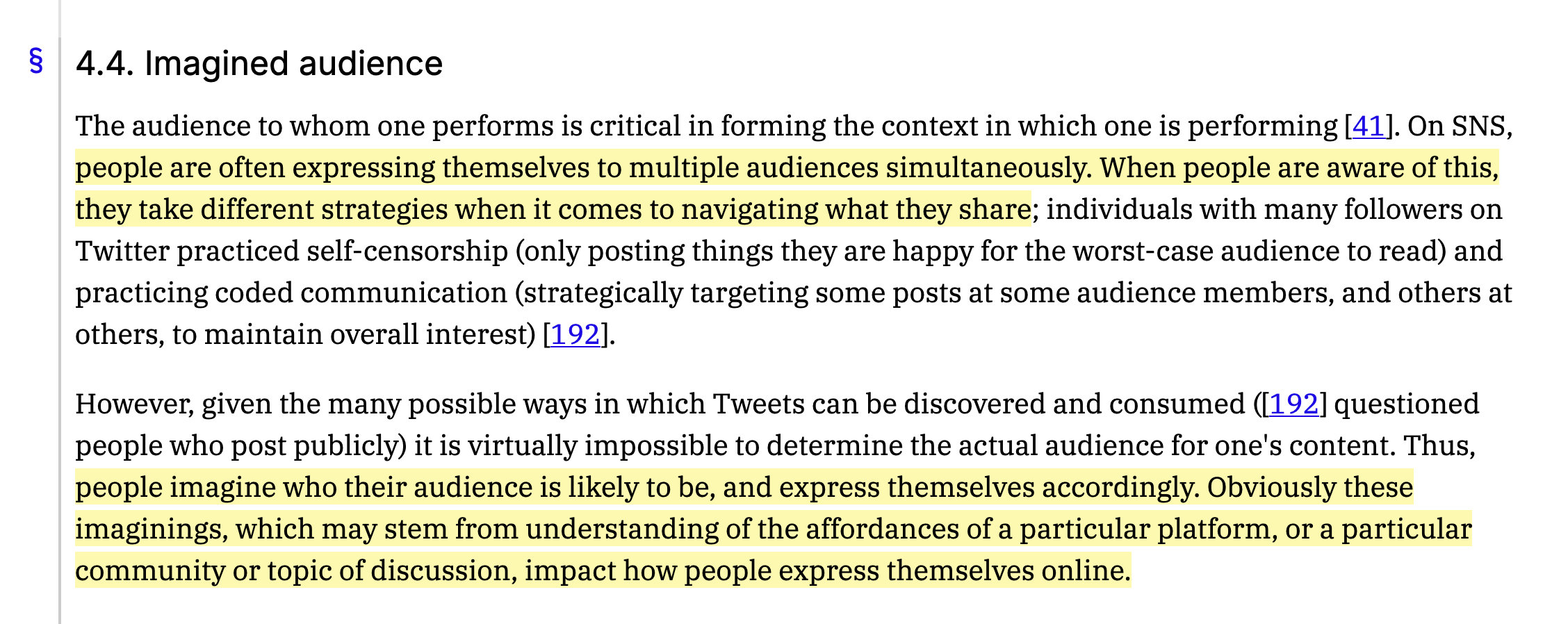 People imagine who their audience is likely to be, and express themselves accordingly. Obviously these imaginings, which may stem from understanding of the affordances of a particular platform, or a particular community or topic of discussion, impact how people express themselves online.
